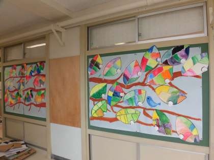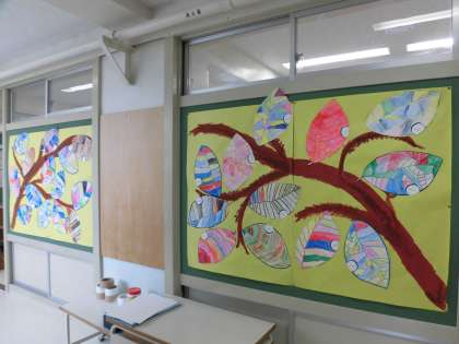 図工の時間に作った、「カラフルなはっぱ」を各学級の教室の前に掲示しました。大きな木の幹に、子どもたちが作った世界に一枚だけのはっぱ。紅葉している葉やほんわかと優しい色の葉。クラスの味が出ている素敵な木になりました。