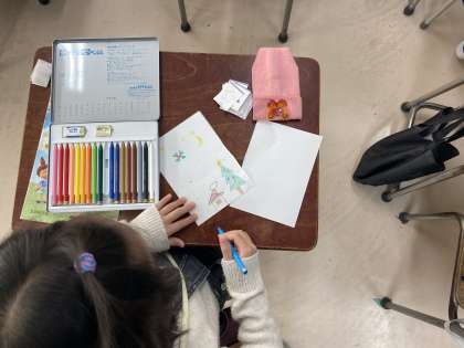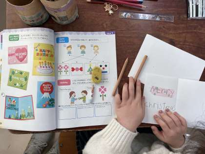 今学期の英語も残すところ2回となりました。現在の単元の学習のまとめに「カードを送ろう」という活動を行います。(送り主は、友達や家族、先生にしています。)