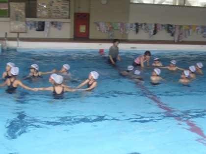 授業の初めの水慣れとして、軽快な音楽に合わせ水中ダンスをしていました。