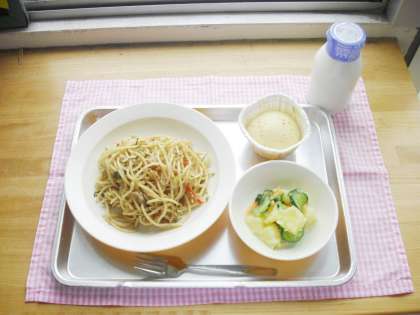 今日の献立は、ごまとじゃこのスパゲティ、じゃがいもサラダ、