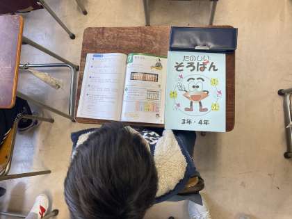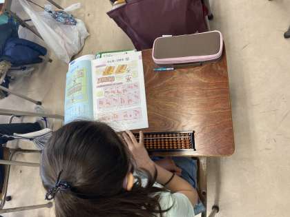 今日は、「定位点」や「はり」などそろばんの部分の名称について確かめた後、簡単な計算をしました。次回は、そろばんを使って引き算に取り組みます。