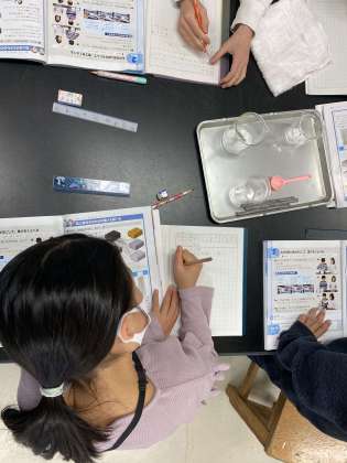 予想では、「体積が同じなら、重さは変わらないと思う」「塩の方が重いと思う」などが出ました。実験では、どの班でも「砂糖の方が軽い!」「重さはちがうんだね」など、同じ体積でも種類が違うと重さが違うことを確かめていました。