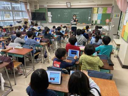 4年生では、ロイロノートを日常から使用しています。この日は、先生が作った「東京のオススメスポット」を子どもたちに共有し、それを参考に「自分たちのおすすめのスポット」を紹介しました。