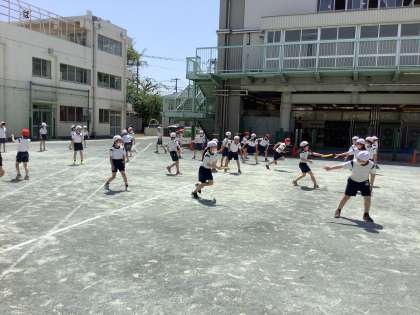 体育の授業では、かけっこに取り組んでいます。「腕を組む」「手足を伸ばす」「寝転んでスタートする」など、あえて走りにくい走り方にチャレンジし、どんなことを意識したら気持ちよく走ることができるかを探求しました。
