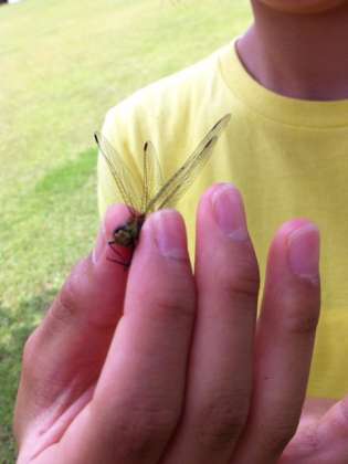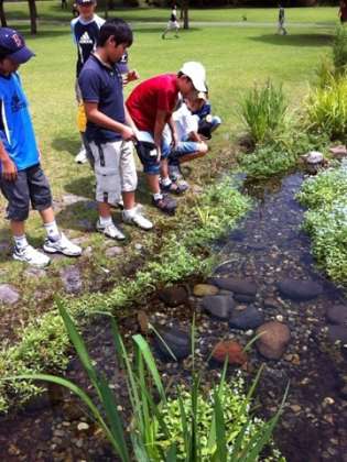 だいや川公園の広い場所で鬼ごっこや、カエル探しをしています。