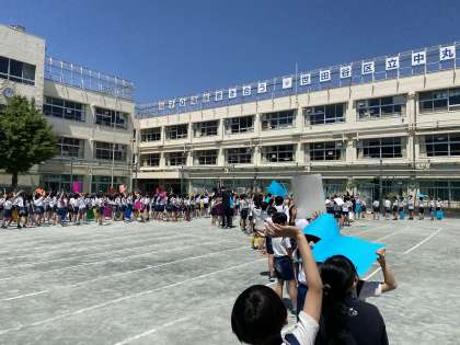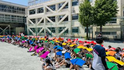 開校70周年記念に向けて、全校写真を2回。クラス写真を1回撮りました。最後の「航空写真」では、全校が校庭で色画用紙を持ち、中丸小学校の校章と富士山、そして七色の虹を描きました。完成がとても楽しみです。普段の学校行事とはまた一味違う、特別な思い出が1つ増えました!