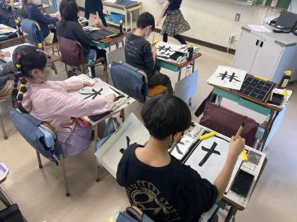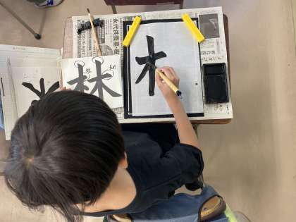 今日は、書写を行いました。題字は、「林」です。たて画や横画、そして「きへん」と「木」の書き方について学習した後、半紙に書いていきました。久しぶりに筆で字を書く子もいて、「難しいな」や「はらいをうまくが書けないな」と苦戦して様子が見られましが、じっくりと取り組み、書くことができました。始筆・終筆に気をつけながら学習をしていました。