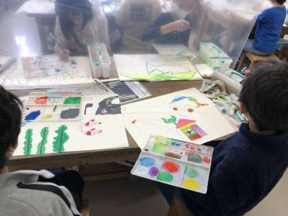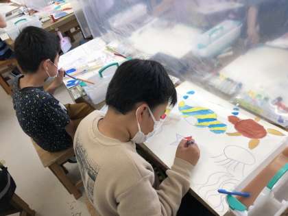 絵の具を使って、デザインに色を塗りました。一人一人の個性が光る、すてきな生き物や模様が描かれていました。虹をイメージさせるような色具合がとてもきれいです。どんな虹の国が完成するのか楽しみですね!