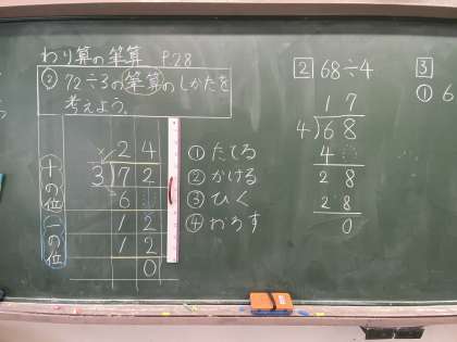 今日は、わり算の筆算を学習しました。筆算の解き方を確認した後、丁寧に筆算をノートに書きました。子どもたちは、とても集中しており、ミスがないように1問1問じっくりと取り組んでいました。明日から、様々な筆算の学習をしていきます。ケアレスミスに気をつけるように指導していきます。