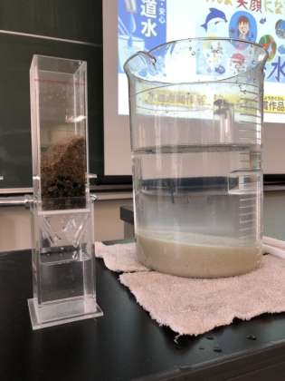 水道キャラバンでは、「水源林が水道水の本となっていること」や「汚れた水がどのように飲料水になるのか」などについて学習しました。