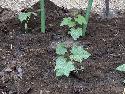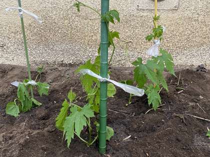 「ヘチマ」と「ゴーヤ」を学級園に植え替えました。大切に育てて、1年間の生長を観察していきます。ところで、写真のどちらがヘチマかゴーヤかわかりますか。答えがわかったら、先生たちに伝えてみてくださいね。
