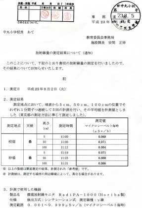 その時の測定結果が、世田谷区教育委員会から届きましたので、お知らせいたします。