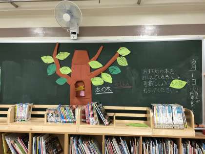 今年度、前期の図書委員の子どもたちから「本の木を作りたい。」という声が上がりました。中丸小学校の図書室にみんなが来てくれるようにという願いがこもっています。「本の木」には、図書室での自分のおすすめの本を「本の葉」に書いて、「本の木」に貼ります。たくさんの子どもたちのおすすめの木の葉がどんどん増えてきています。