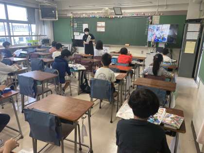 朝、時間になるとオンラインで参加する子どもたちが続々と集まっていました。初めは、緊張した表情も見られましたが、時間が経つと笑顔も見られ、安心しました。分散登校の授業では、画面にいる子どもたちとやりとりしながら、工夫して進めています。