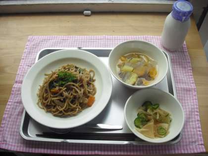 今日の献立は、ソース焼きそば、きゅうりと大根のごま風味、フルーツみつ豆、