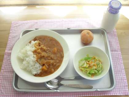 今日の献立は、ハヤシライス、コーンサラダ、冷凍みかん、牛乳です。