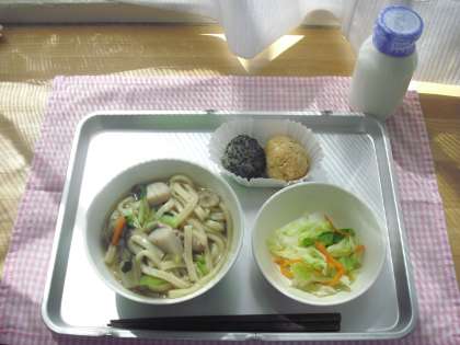 今日の献立は、けんちんうどん、野菜の甘酢あえ、おはぎです。