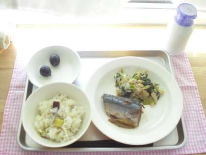 今日の献立は、さつまいもごはん、さんまのしょうが煮、きのこ入り煮びたし、