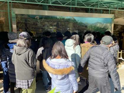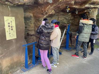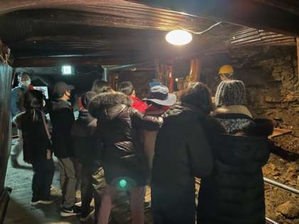 外に出ると、鉱山模型がありました。トロッコやリフトが動く仕組みで、興味津々の様子でした。さく岩機体験はボタンを押すと実際に振動を体験することができ、音の大きさに驚いていました。