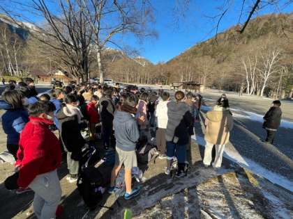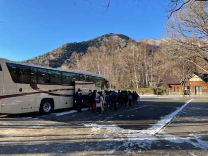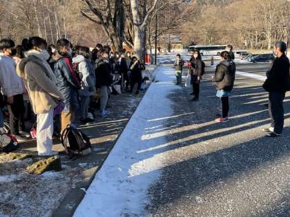 雲一つない青空の下、閉園式を行いました。3日間お世話になった宿舎の方々に、お礼の挨拶をしました。楽しい時間を過ごした宿舎を出発し、日光江戸村に向かいます!