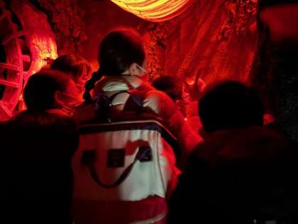 グループごとに歩いて散策しながら、体験をしています。地獄寺では悲鳴が響く声を聞きつつ、意を決して入っていく勇ましい後ろ姿が見られました。