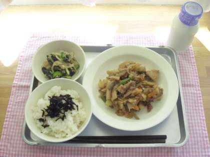 今日の献立は、ごはん、ひじきのふりかけ、きんぴら煮、じゃこサラダ、