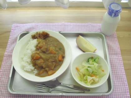 今日の献立は、カレーライス、野菜の甘酢和え、りんご、牛乳です。