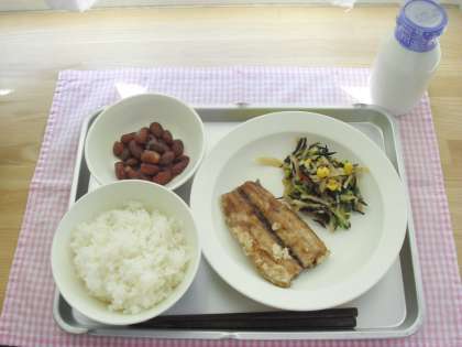 ごはん、さんまのかば焼き風、大根とひじきのサラダ、煮豆、