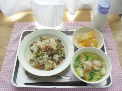 今日の献立は、きのこごはん、白菜と肉団子のスープ、フルーツ