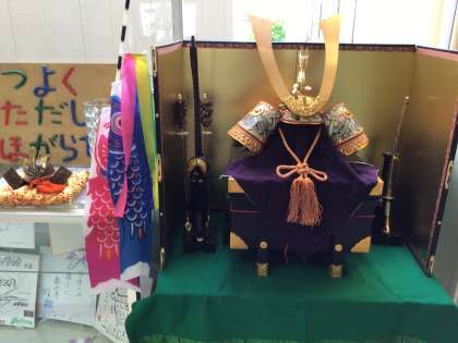 校長室前に五月の節句の兜とこいのぼりが飾られました。子どもたちは「かっこいい!」とうれしそうです。
