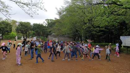 世田谷公園でみんなでもうじゅうがりゲームで遊んでます。