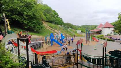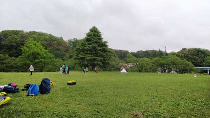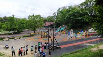 霧雨も雨雲もすっかりなくなり暑いくらいです。13:10まで遊具広場で遊び中丸小学校に帰ります。