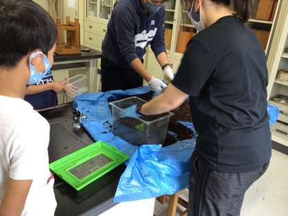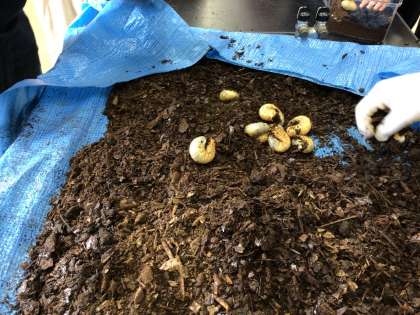 昨日と今日の2日間、かごを持った低学年の子どもたちが出現しています。理由はカブトムシの幼虫を入れるからです。地域の方からいただいた大きく立派なカブトムシの幼虫です。大切な命を預かったので大事に育ててほしいです。