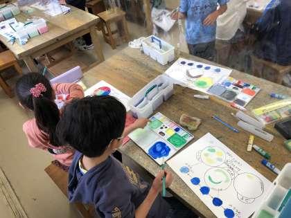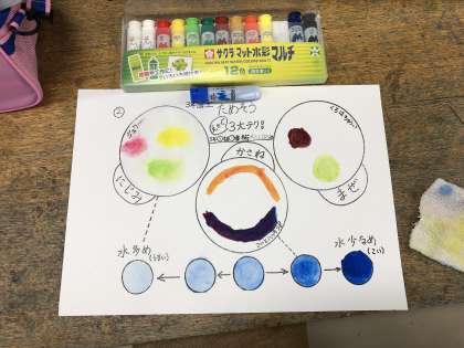3年生の図工は、図工室で専科の先生に教えていただきます。はじめの学習は、絵の具の使い方です。水の量を変えると、「にじみ」を作り出すことができます。いろいろなにじみを創りだして、ワークシートに色をつけました。これからは、にじみを使った作品作りをしていきます。