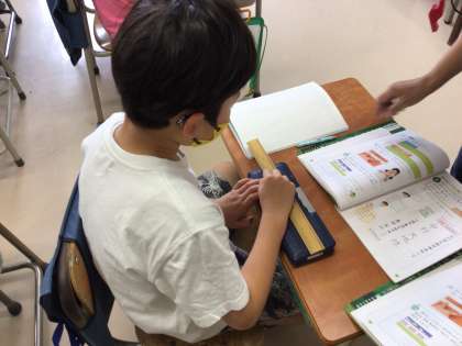 2年生は「長さ」の量感の学習を行っていました。日常生活の中で見聞きしていた長さの単位「cm」ですが、思いのほか、「小さい」ようで、教室のあらゆるものの長さを物差しで測りとり実際の長さと量感を確かめていました。