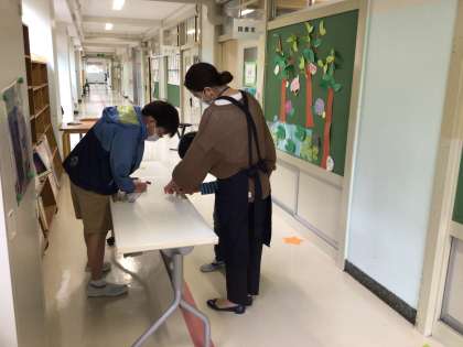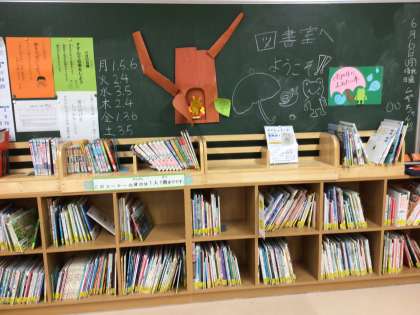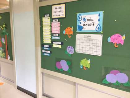 雨の日が続きます。落ち着いて本を読める図書室があるとよいのですが、本校の図書室は狭く、読むためのスペースがとれません。なんとかしたいなあと思っていたら、図書委員の子どもたちが、長机1つ分ですが、本を読むスペースを実現しました。雨の日は、静かに本に親しんでほしいです。