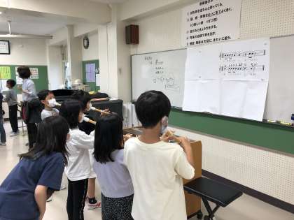 リコーダーの学習が始まり、だんだんと音を出すのが上手になってきました。「シ」と「ラ」の音を学習し、今日は、短い曲を3曲挑戦です。シとラの切り替わりが難しいですが、自分で練習する曲を選んで、一生懸命取り組んでいました。これから、新しい音を覚えて、色々な曲を演奏できるのが楽しみです。