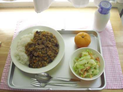 今日の献立はドライカレーライス、キャベツサラダ、みかん、