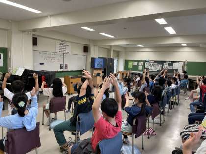 4年生の音楽では、オペラ「魔笛」からパパゲーノとパパゲーナの二重唱を鑑賞しました。男声が聴こえたら左手、女声が聴こえたら右手を挙げる活動をし、2人の歌声がかけ合っているところと重なっているところがあることを学習しました。また、登場人物が歌う様子を実際の映像を見て、歌手の衣装や表情、動きからオペラの面白さを味わいました。なかなか馴染みのないオペラに、少しでも魅力を感じてもらえたらと思います。