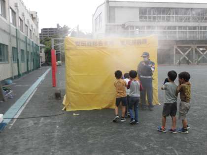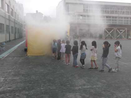本日の避難訓練は煙中訓練を行いました。無害の煙を充満させたテント内を移動する体験をしました。「出口がすぐにわからなかった。」「ハンカチがあって良かった。」という子どもたちの声が聞かれました。煙の中では姿勢を低くして移動することやいざというときのハンカチの大切さを学ぶことができました。