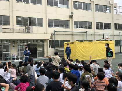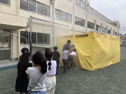 今日の避難訓練では、煙中訓練をしました。初めに、大切なことを3つ教えていただきました。まず、「口にハンカチを当てること」次に、「姿勢を低くして避難すること」火災の際は、黒くて200度にもなる煙が出るそうです。最後に、「壁づたいに避難すること」でした。子どもたちは、これらのことに気を付けながら、「煙で前が見えづらいよ。」と急いでテントから避難をしていました。これから少しずつ外出することが増えてくることと思います。外出の際に、非常口を確認して過ごすことの大切さも教えていただきました。