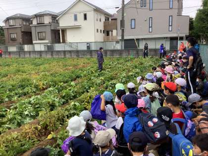 本日、秋山農園さんの畑にじゃがいも掘りに行ってきました。1年生のときには、さつまいも掘りが出来なかったので、初めて畑に来たという子たちもいました。農家の方に掘り方を教えていただき、みんなでじゃがいもを掘りました。