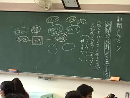 4年生がウェブマッピングという思考ツールを使って話し合っていました。この後、読み手にとって分かりやすい新聞を書くという学習に展開していきます。大好きなクラス、先生、友だちのよさを、何としても中丸のみんなに伝えたいという4年生の子どもたちの思いがあふれていました。