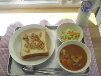 今日の献立は、つぶつぶピーナッツトースト、トマトシチュー、