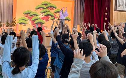 6月29日、旭小学校の体育館にて、狂言「附子」を鑑賞しました。初めに附子の内容についての解説があったため、楽しめた様子でした。また、狂言の動きや発音の仕方なども教わりました。