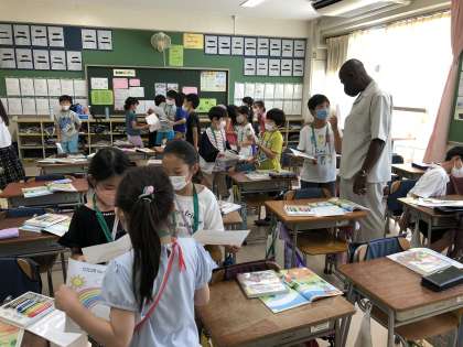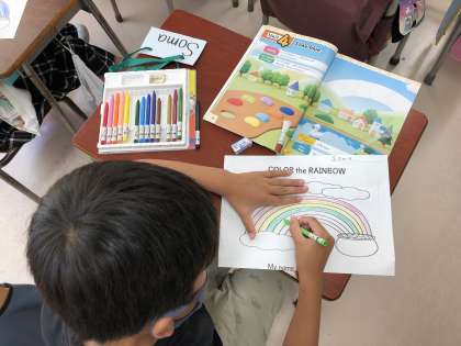 外国語の学習では、色の学習をしています。虹にある色やその他の色の言い方を確認し、世界の子どもたちの描いた虹を動画で確認して、国によって表し方が違うことに気付きました。その後、自分たちのオリジナルの虹を描いて、友達と英語で紹介し合いました。