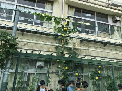 4年生の理科の学習で育てているヘチマとゴーヤがぐんぐん育ち2階まで伸びています。小さい実もありました。終業式までの登校があと10日間です。1学期、ヘチマとゴーヤのようにぐんぐん成長した子どもたちです。