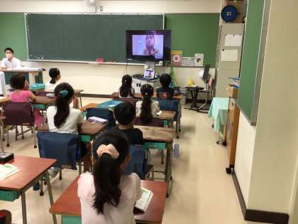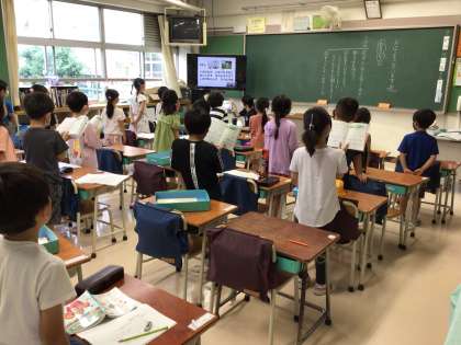 今日は1学期最後の音楽朝会です。換気をし、マスクをしたまま、一方向を向いて歌います。「なつはきぬ」の意味を知った後、音の響きを感じながら歌いました。