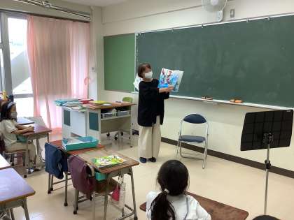 先日、おはなし広場の方々が教室で読み聞かせをしてくださいました。どのお話も魅力的で子どもたちは、物語の世界観に引き込まれていました。
