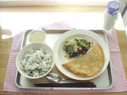 今日の献立は、わかめごはん、ジャンボぎょうざ、和風サラダ、